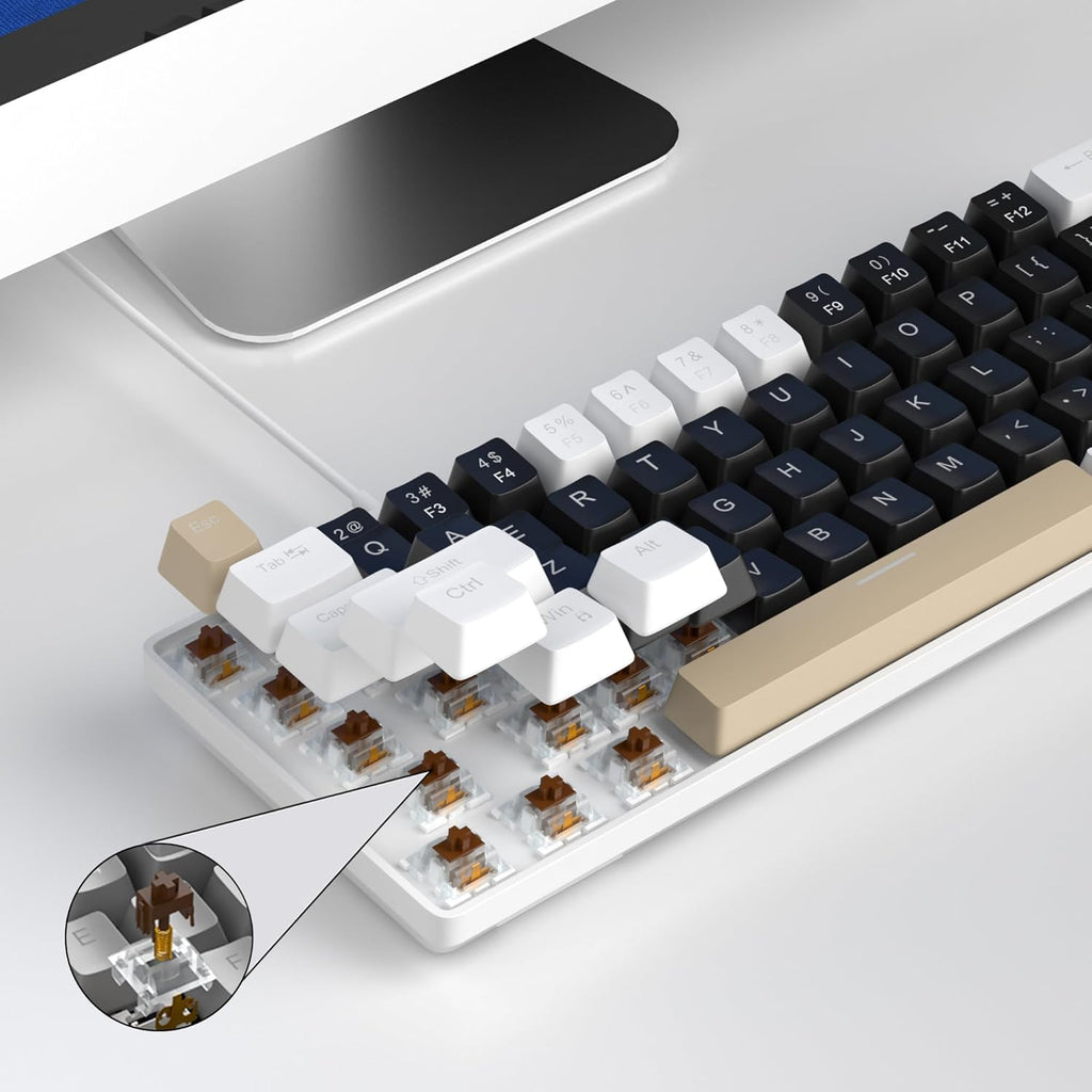The Magegee MK-BOX is a compact 68-key wired mechanical keyboard featuring reliable brown switches that offer a tactile and quiet typing experience ideal for both professionals and enthusiasts. Its blend of white, black, and brown accents provides a sleek, modern aesthetic suitable for any setup. This keyboard ensures precise key registration and durability, making it perfect for extended use in work or gaming environments where accuracy and responsiveness are essential.